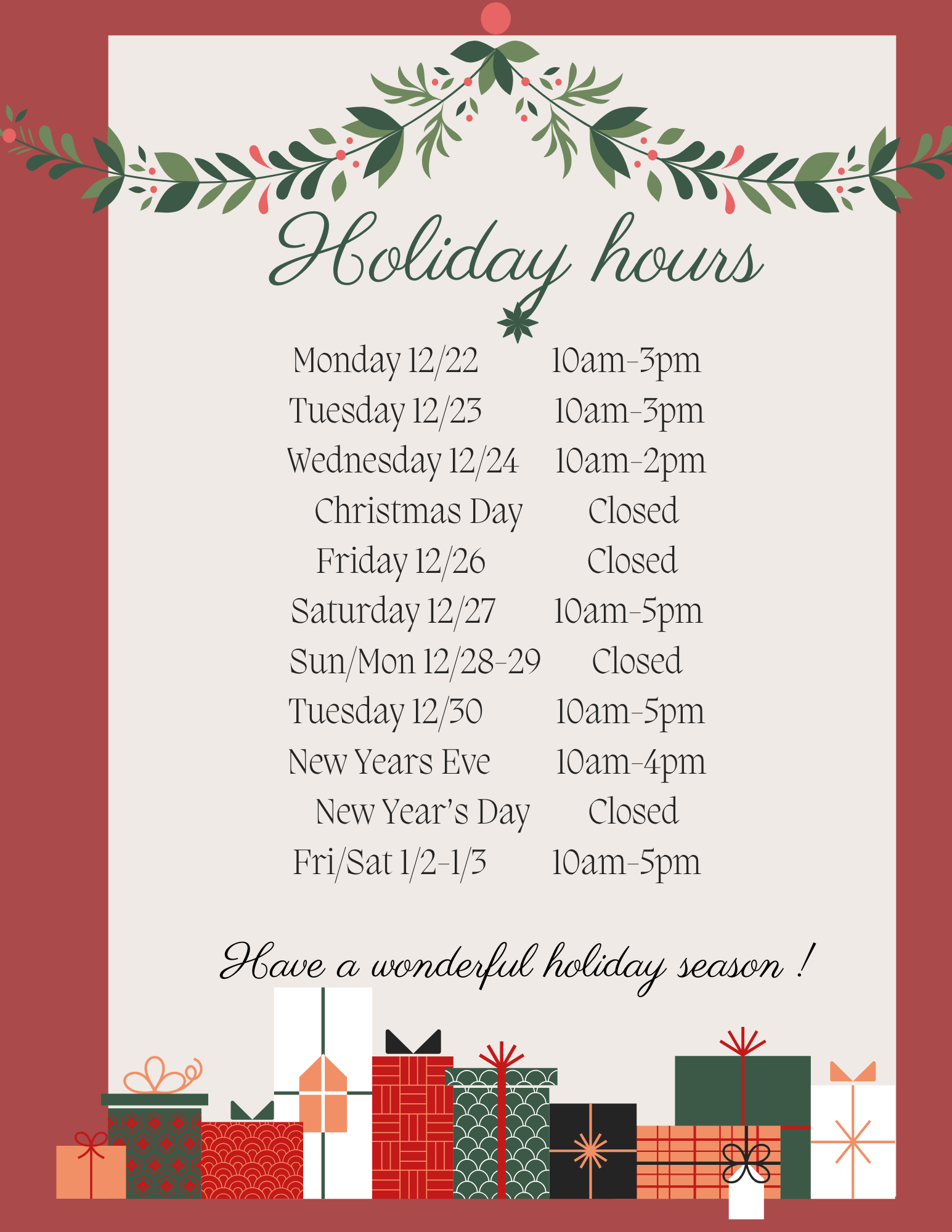 Holiday Hours